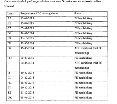 ABC. Pediatrische Verordening. Weesgeneesmiddel. Novartis is houdster van ABC NL300086, dat is verkregen na verloop van het basisoctrooi EP0564409, voor de werkzame stof imatinib, wat als weesgeneesmiddel is aangewezen voor de behandeling van chronische myeloïde leukemie. Novartis breidt haar handelsvergunning uit met nieuwe indicatie voor pediatrische patiënten, waardoor de ABC met een duur van zes maanden, ofwel op basis van de Weesgeneesmiddelenverordening, een marktexclusiviteit van twee jaar. Verlenging van de ABC-termijn voor uitgevoerd pediatrisch onderzoek ook mogelijk als geneesmiddel eerder als weesgeneesmiddel aangewezen is geweest. Inbreukverboden worden gegeven.